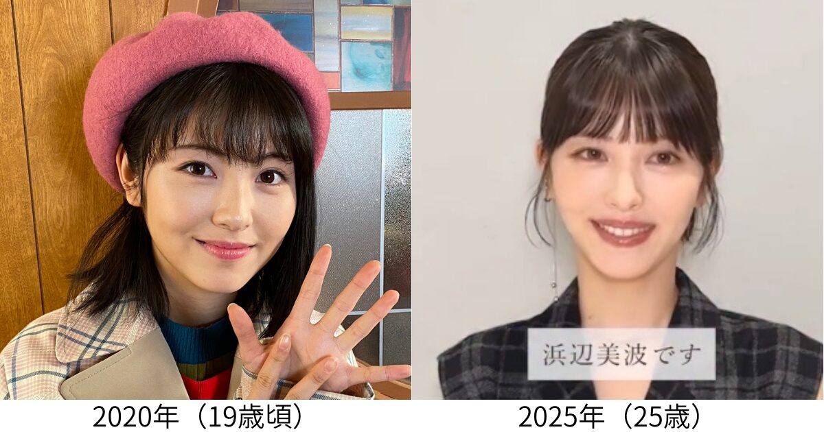 上の写真左が19歳頃の浜辺美波さん、右が25歳の浜辺美波さんですが、確かにこの画像だと、別人に見えるくらい浜辺美波さんの顔が変わったような印象を受けます。