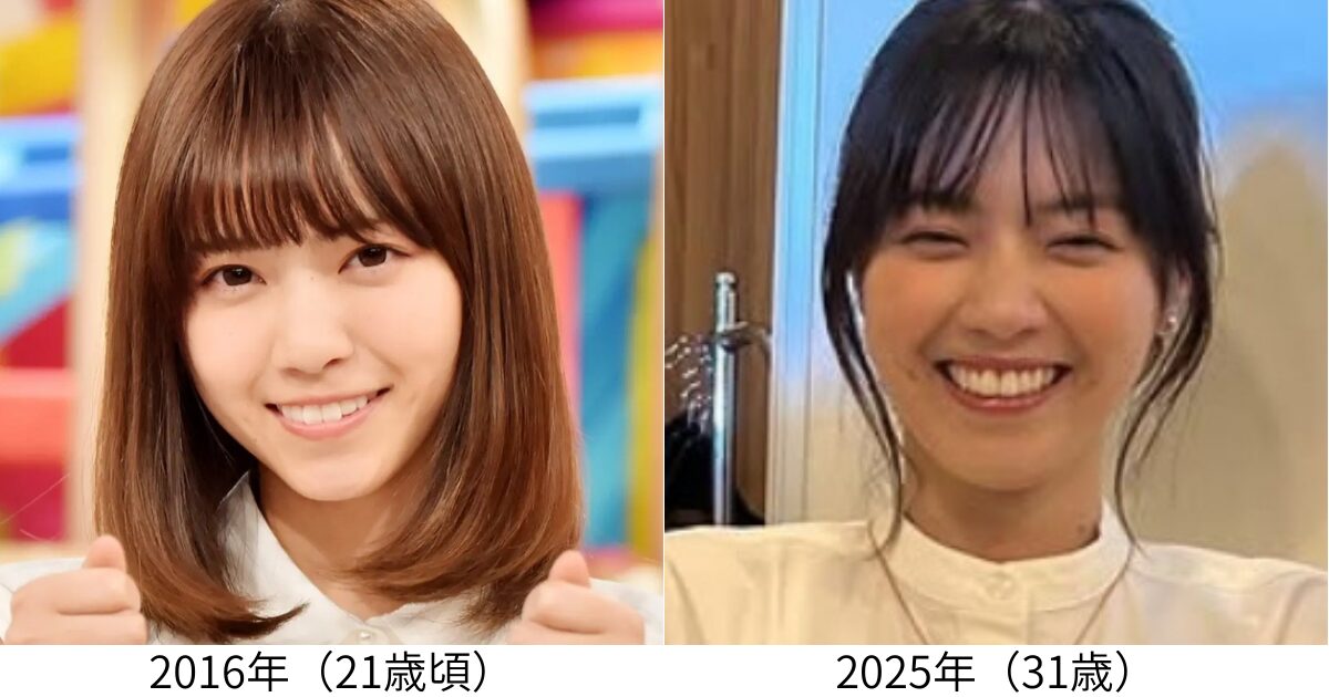 どちらの西野七瀬さんも笑顔が可愛くて素敵ですが、2025年の西野七瀬さんは21歳頃と比較すると輪郭が少しふっくらしたような印象を受けます。
