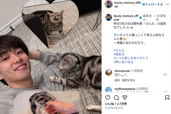 野村康太さんのInstagramでは、野村康太さんと愛猫・さんたが自宅でくつろぐ様子が投稿されていて、ファンからは「可愛すぎる」と多くのコメントが寄せられています。