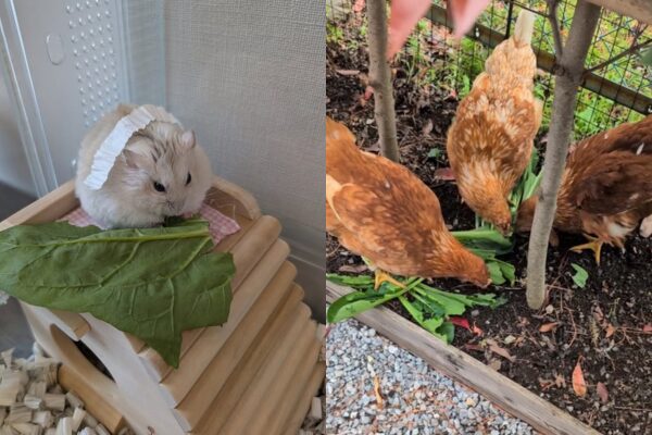 上の写真の左が、イエロージャンガリアンハムスターで、名前は「つぶ」こと「つぶらひとみ」さんで、右が「うるる」「ひより」「ちよの」という名前のにわとり三姉妹です。
